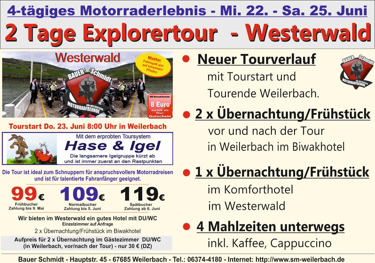 Westerwald und Rheintal 2 Tage Westerwald Anreise Mittwoch, 22. Juni zum Bikertreff Übernachtung in Bauer's Biwakhotel (im Preis enthalten) Tourstart Donnerstag, 23. Juni – 8.00 Uhr ab Weilerbach Biker-Frühstück – ab 7 Uhr (im Preis enthalten) Die Tour führt von Weilerbach über Hallgarten, Schloß Böckelheim nach Bingen. Fährüberfahrt über den Rhein nach Rüdesheim und weiter am Niederwald Denkmal vorbei, mit herrlichem Ausblick auf die Rheinschleife.